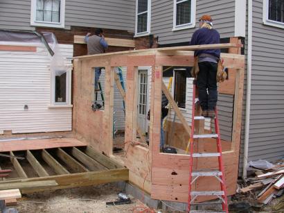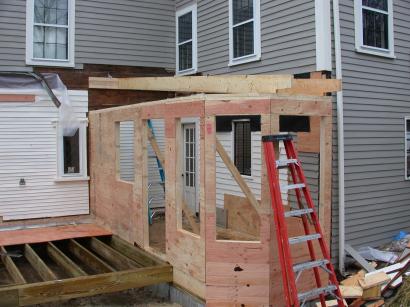 Jim installs the first rafter header, while Frank watches. The cell phone is permanently attached to Jim's ear.