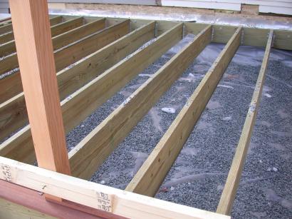 Plastic vapor barrier installed and gravel being added to ground under porch