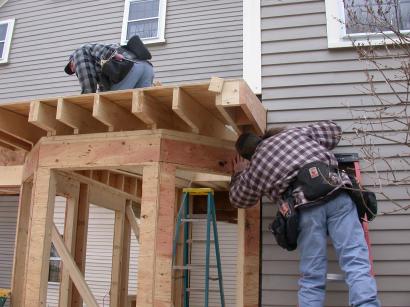 Mike works on second addition overhang while Frank installs addition roof plywood