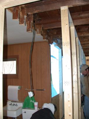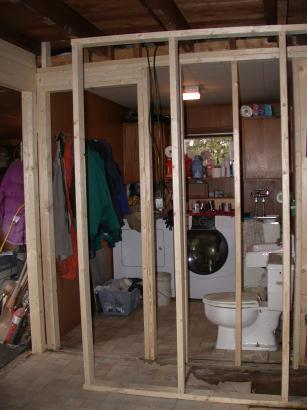Wall to laundry room before old studs to the second floor are cut off at the height of the new wall.