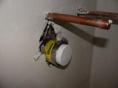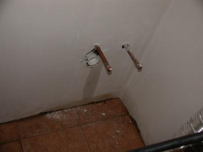 The dry wall guys buried the laundry sink drain. Running the washer caused a leak in this drain which resulted in a wet wall, floor and eventually a hole through the plaster where the drain is. I capped the drain hole so that the washer could be used