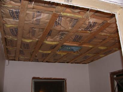 Insulation replaced in laundry room, ready for dry wall on ceiling.