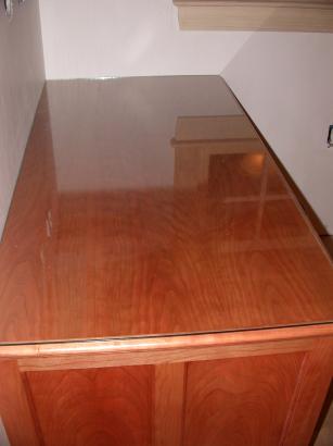 Desk top has been installed. It is a cherry wood top with a glass cover.