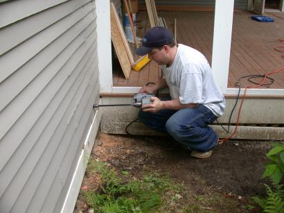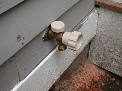 Johnny drills a hole for the new silcock. This is a frostfree type that does not have to be drained for the winter.