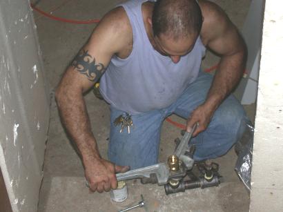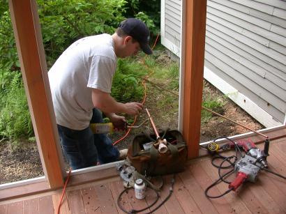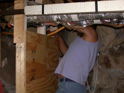 Sal applies some muscle in connecting basement run to the run from the cooktop through the crawl space.
