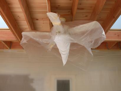 The fan light is covered up prior to spraying wood preservative on the porch ceiling.