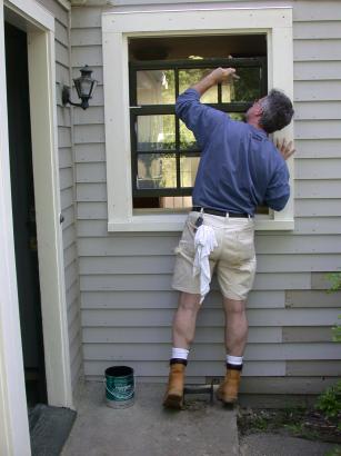 Billy spackles the outside sash.