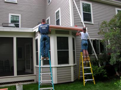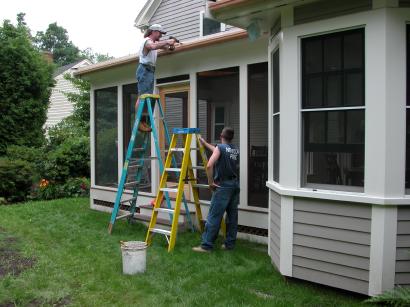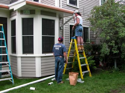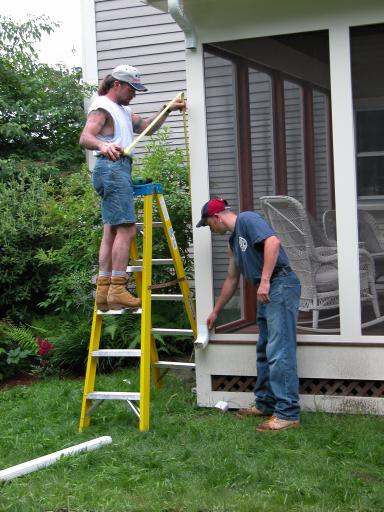 Installing the porch gutter.